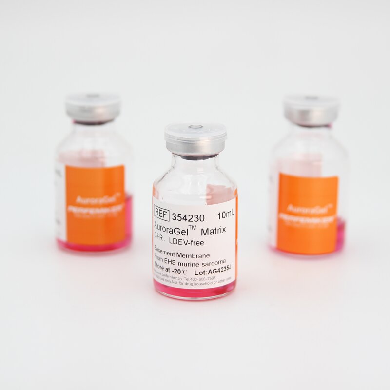 PERFEMIKER® AuroraGelTM Matrix GFR是從富含胞外基質(zhì)蛋白的小鼠腫瘤中提取出的天然基底膜基質(zhì)。主要依次為層粘連蛋白(Laminin)、IV型膠原蛋白(Col-IV)、巢蛋白(Entactin)、硫酸乙酰肝素蛋白多糖(Heparan sulphate proteoglycans)及多種細胞因子,如類胰島素生長因子(IGF-1)、轉(zhuǎn)化生長因子β(TGF-β)、血管內(nèi)皮生長因子(VEGF)、表皮生長因子(EGF)、成纖維細胞生長因子(bFGF)等。產(chǎn)品溶解于高糖含酚紅DMEM中,且非定制產(chǎn)品均添加了50μg/mL慶大霉素。在室溫條件下,聚合形成具有生物學(xué)活性的三維基質(zhì),模擬體內(nèi)細胞基底膜的結(jié)構(gòu)、組成、物理特性和功能,有利于體外細胞的培養(yǎng)和分化。適用于需要減少生長因子誘導(dǎo)的背景信號,對基底膜制備要求較高的研究應(yīng)用。