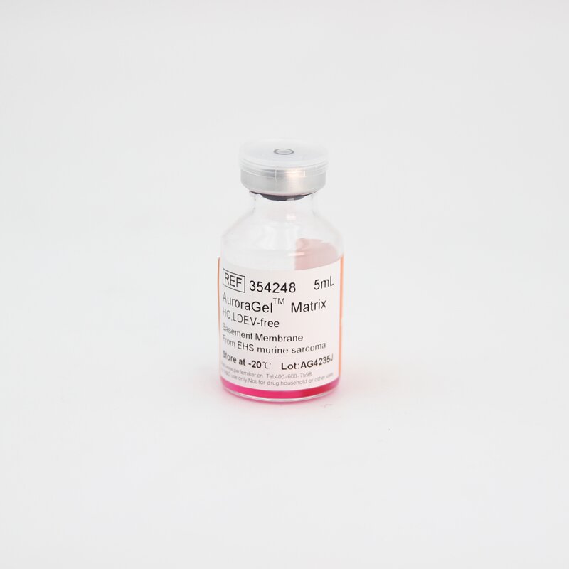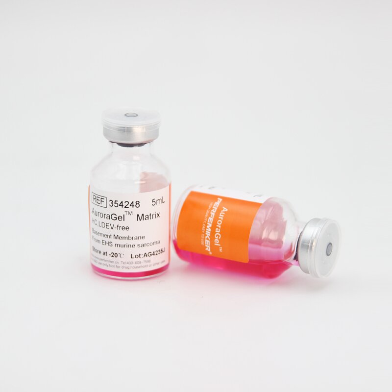 PERFEMIKER® AuroraGelTM Matrix HC是從富含胞外基質(zhì)蛋白的小鼠腫瘤中提取出的天然基底膜基質(zhì)。主要依次為層粘連蛋白(Laminin)、IV型膠原蛋白(Col-IV)、巢蛋白(Entactin)、硫酸乙酰肝素蛋白多糖(Heparan sulphate proteoglycans)及多種細(xì)胞因子,如類胰島素生長(zhǎng)因子(IGF-1)、轉(zhuǎn)化生長(zhǎng)因子β(TGF-β)、血管內(nèi)皮生長(zhǎng)因子(VEGF)、表皮生長(zhǎng)因子(EGF)、成纖維細(xì)胞生長(zhǎng)因子(bFGF)等。產(chǎn)品溶解于高糖含酚紅DMEM中,且非定制產(chǎn)品均添加了50μg/mL慶大霉素。在室溫條件下,聚合形成具有生物學(xué)活性的三維基質(zhì),模擬體內(nèi)細(xì)胞基底膜的結(jié)構(gòu)、組成、物理特性和功能,有利于體外細(xì)胞的培養(yǎng)和分化。本系列分為標(biāo)準(zhǔn)高濃度和低因子高濃度,它們的粘度較高,凝膠時(shí)間較快,更適合于體內(nèi)實(shí)驗(yàn)(動(dòng)物模型)常被應(yīng)用于PDX/CDX模型建立、體內(nèi)血管生成測(cè)定等。