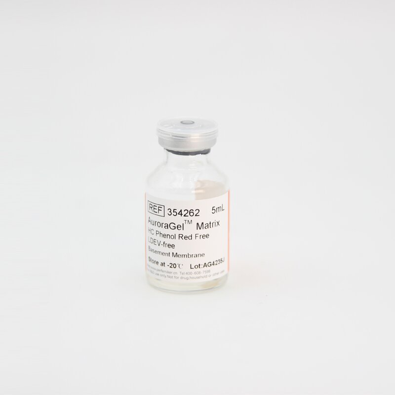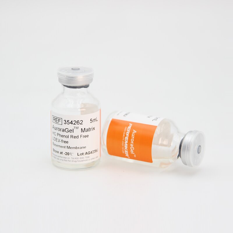 PERFEMIKER® AuroraGelTM Matrix(HC Phenol Red Free)是從富含胞外基質(zhì)蛋白的小鼠腫瘤中提取出的天然基底膜基質(zhì)。主要依次為層粘連蛋白(Laminin)、IV型膠原蛋白(Col-IV)、巢蛋白(Entactin)、硫酸乙酰肝素蛋白多糖(Heparan sulphate proteoglycans)及多種細(xì)胞因子,如類胰島素生長(zhǎng)因子(IGF-1)、轉(zhuǎn)化生長(zhǎng)因子β(TGF-β)、血管內(nèi)皮生長(zhǎng)因子(VEGF)、表皮生長(zhǎng)因子(EGF)、成纖維細(xì)胞生長(zhǎng)因子(bFGF)等。產(chǎn)品溶解于高糖含酚紅DMEM中,且非定制產(chǎn)品均添加了50μg/mL慶大霉素。本系列分為標(biāo)準(zhǔn)高濃度和低因子高濃度,它們的粘度較高,凝膠時(shí)間較快,更適合于體內(nèi)實(shí)驗(yàn)(動(dòng)物模型)常被應(yīng)用于PDX/CDX模型建立、體內(nèi)血管生成測(cè)定等。