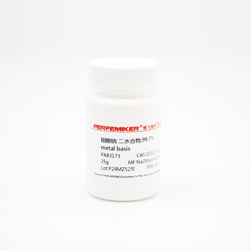 博飛美科的鉬酸鈉 二水合物,99.7% metal basis為鉬,產(chǎn)品穩(wěn)定,定制速度快,極大地方便了廣大科研客戶的使用需求。產(chǎn)品包裝為25g。查詢關(guān)鍵詞:鉬,10102-40-6,鉬酸鈉 二水合物,99.7% metal basis,Sodium molybdate dihydrate,博飛美科,Perfemiker,上海,廠家現(xiàn)貨。
